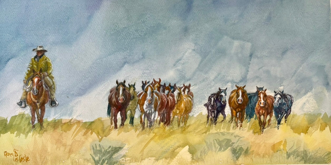 14X21" original watercolour. This painting is from a photo by Lou Parsonage of her son Jess, bringing their mares home for breeding. Parsonages raise some of the finest quarter horses you'll ever find, in the extraordinarily beautiful Cypress Hills of Saskatchewan.
