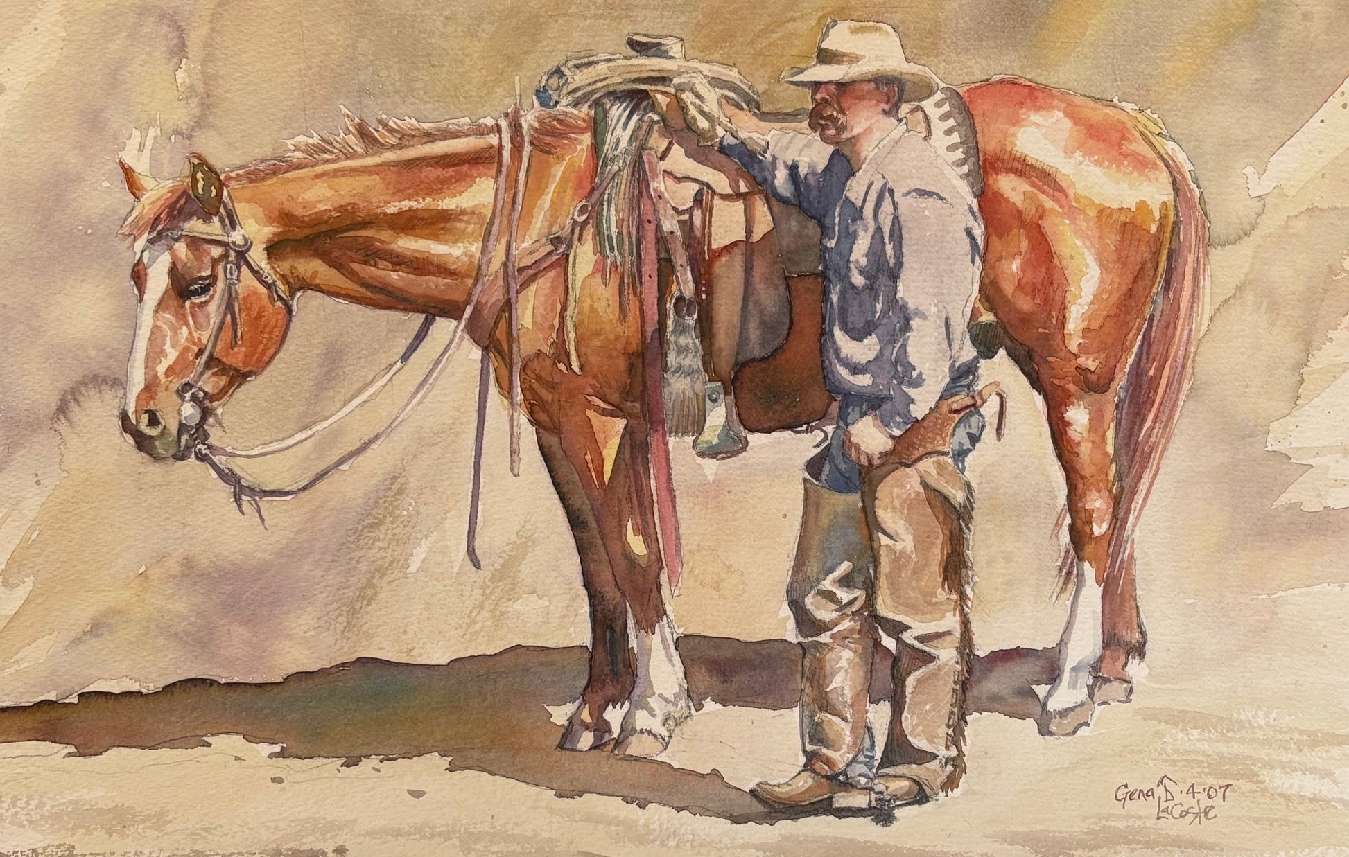 When there's work to be done in the ranching community...branding, weaning, gelding, gathering....it's inevitable that the neighbours will show up. And usually they bring their horses. Many families work together and have for decades, or even generations. This often means getting up well before daylight, capturing the mounts, loading and then driving many miles in order to be there for the work day, which can be long and hard, be done in freezing cold or searing heat and dust. OR it could be just a lovely fall day, like depicted here with my friend Lee and his trusty old gelding.