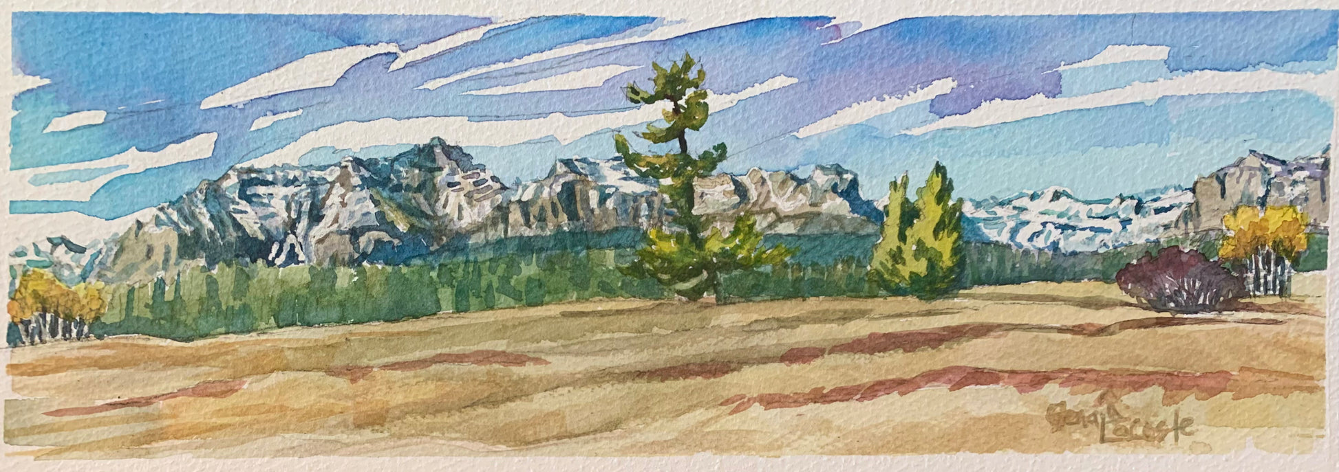 Good friends run the sleigh rides in winter and trail rides in summer at the famous Lake Louise. When their horses (heavy horses in summer, saddle horses in winter) are on summer or winter break, they pasture them here in this stupendously magnificent landscape. This is where the prairie and the mountains meet, and if you'd like a little slice of heaven to remind you of that, this little painting is happy to come to you.